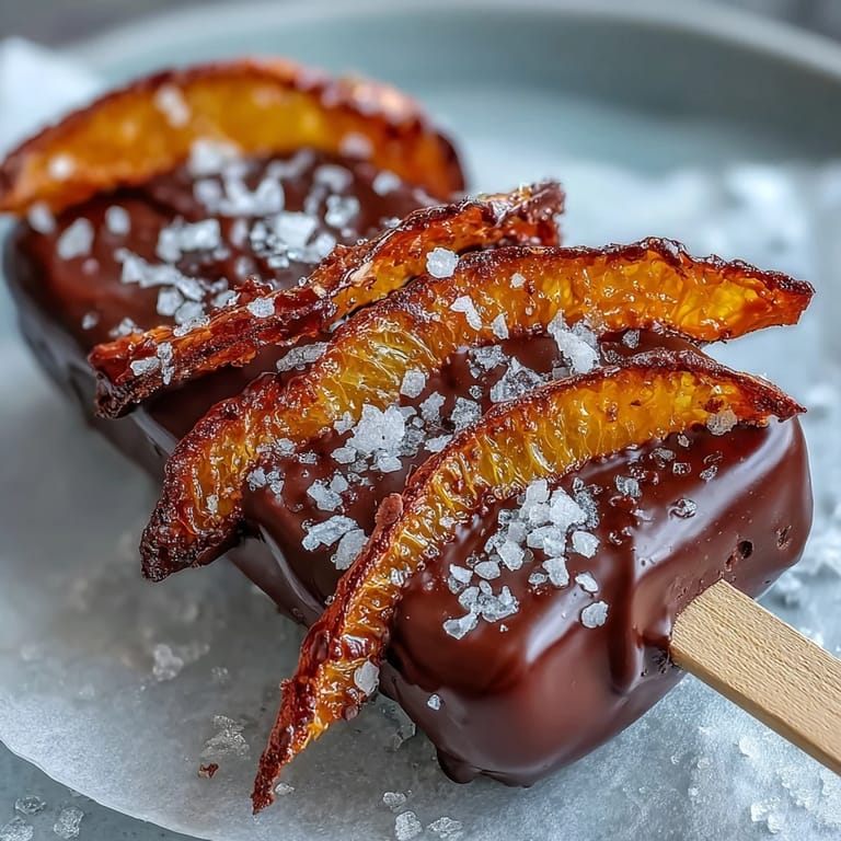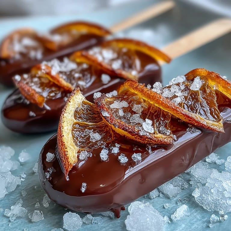 - Take each wooden stick and thread 2–3 pieces of candied orange peel onto it, spacing them a bit apart so the chocolate can coat between them. Dip the lower half of the stick into your melted chocolate, twisting gently so every surface gets covered, then lay it flat on parchment. If you're adding sea salt, sprinkle it immediately while the chocolate is still tacky.