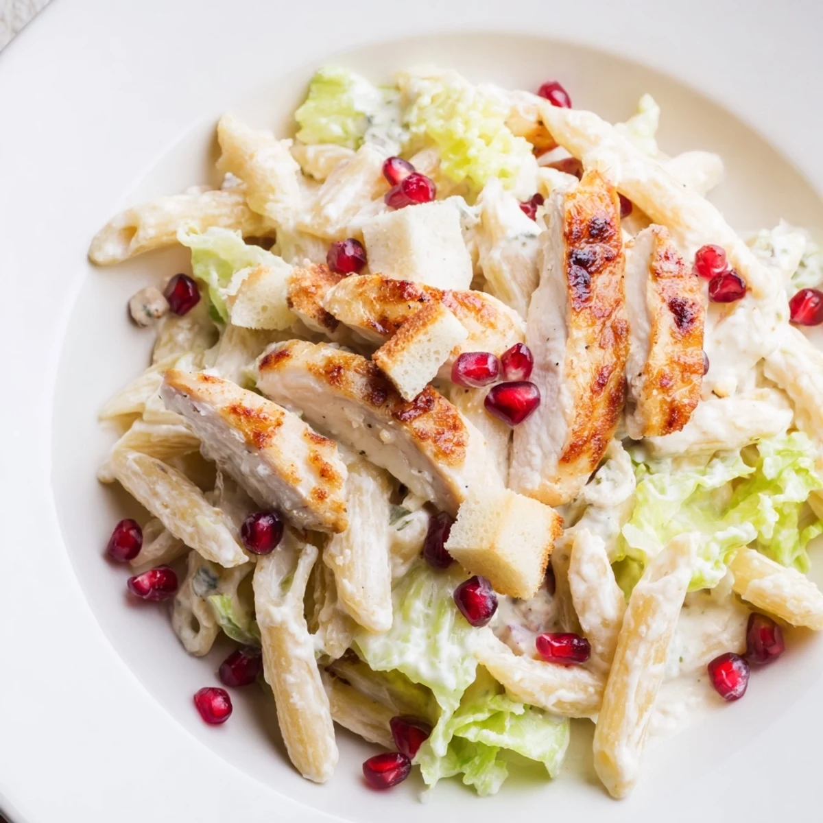 Save to Pinterest My sister called me in a panic the night before hosting her book club, asking if I could bring something impressive but not complicated. I remembered a Caesar salad she'd raved about at a restaurant, and I thought—what if I made it into a warm pasta dish? I grabbed chicken from the freezer, some pomegranate I'd been saving for a special moment, and threw together what would become her guests' most-requested recipe. That spontaneous kitchen experiment turned into something we now make for every gathering.
