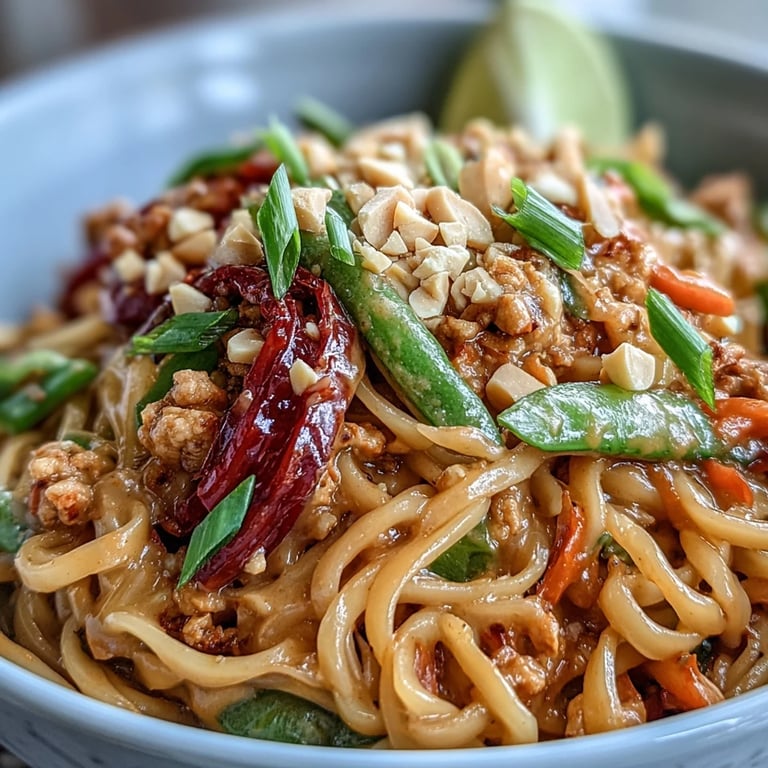 Save to Pinterest My skillet was smoking before I realized I'd been staring at the noodles too long, lost in thought about dinner parties that never quite go as planned. That night, I was supposed to make something impressive, but I was exhausted and craving comfort instead of complexity. I threw together what I had: ground chicken, a jar of peanut butter, and some vegetables that were starting to look sad in the crisper. What emerged was this bowl of creamy, tangy, slightly spicy noodles that made everyone forget I'd abandoned the original menu entirely.