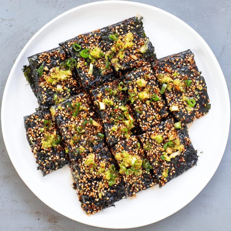 Save to Pinterest Crispy, savory seaweed snacks inspired by the flavors of the ocean, perfect for a light bite or a healthy snack on the go.