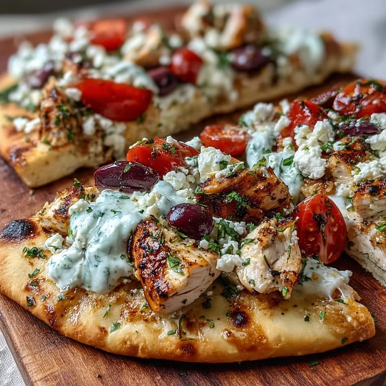 Save to Pinterest My kitchen was a mess of flour and spilled olive oil when I threw together these pizzas on a Tuesday night, too tired to follow a proper recipe. The naan breads were sitting in my freezer, the chicken needed using, and I had half a block of feta that was about to turn. What came out of the oven tasted like a holiday I never took. The lemon cut through the richness, the olives added that briny punch, and the tzatziki cooling everything down made it feel like I'd actually tried.