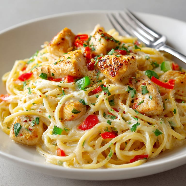 - Return the cooked chicken and drained spaghetti to the saucy skillet. Toss everything together using tongs so every strand is coated. Stir in optional veggies if using. Simmer gently for two to three minutes until everything is piping hot and saucy.