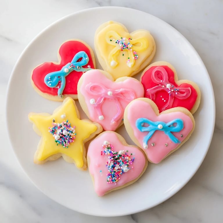 Save to Pinterest Adorable sugar cookies in heart and star shapes, decorated with colorful icing and charming bow designs—perfect for celebrations, gifts, or afternoon tea.