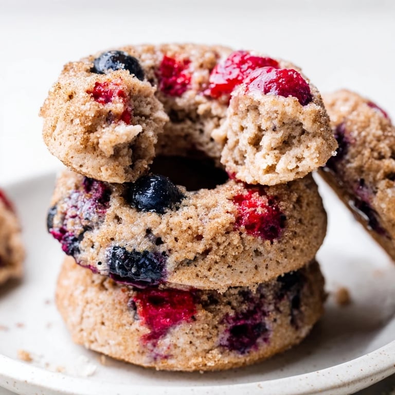 Save to Pinterest Soft, fluffy baked doughnuts packed with juicy berries, a hint of cinnamon, and boosted with protein for a nutritious, guilt-free treat.