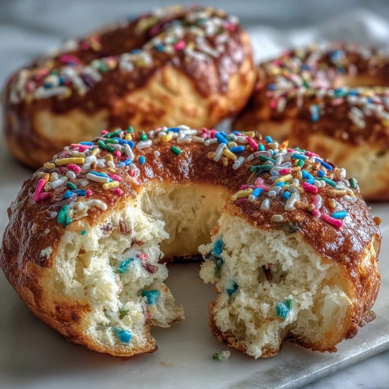 Save to Pinterest My sister called at 7 AM on her birthday asking if I could make something special for breakfast that didn't feel like a diet food—something colorful and fun that actually tasted like celebration. I had Greek yogurt and protein powder sitting in my pantry, and instead of the usual protein pancakes, I wondered what would happen if I treated them like bagel dough. Twenty minutes later, these rainbow sprinkle bagels came out of the oven, and she showed up an hour later with the biggest smile, declaring they were better than actual cake for breakfast.