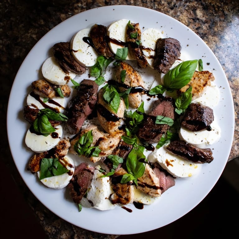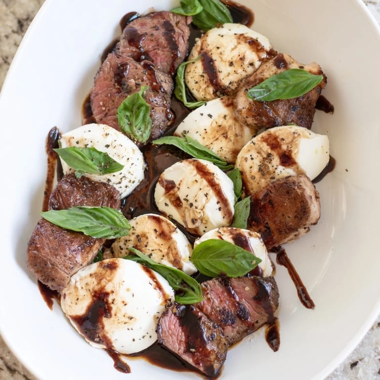 - Drizzle the cooled balsamic glaze over just the meat strips—the cheese is already rich, and the contrast matters. Tear basil leaves by hand and scatter them across, then finish with a generous grind of black pepper that catches the light.