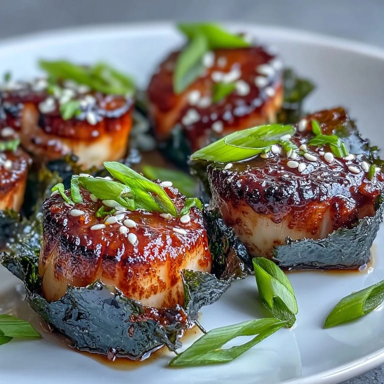 Save to Pinterest Experience the perfect balance of Japanese-inspired flavors with these Seaweed-Wrapped Scallops. Succulent sea scallops are wrapped in crisp nori seaweed, pan-seared until golden and tender, and served with a vibrant, zesty ponzu dipping sauce that elevates every bite.