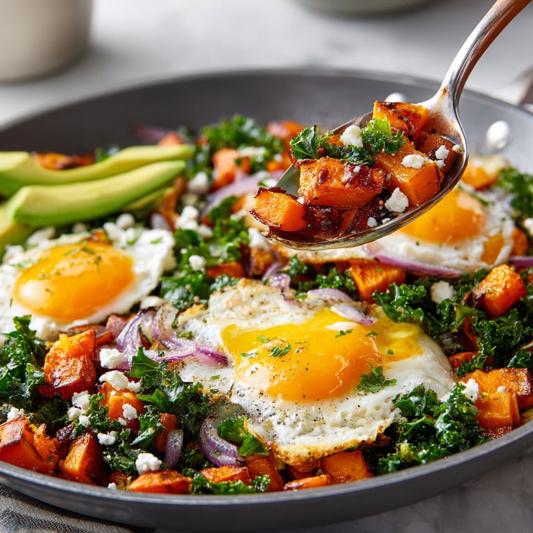 Save to Pinterest Sweet Potato Hash with Kale and Fried Eggs is a wholesome meal that hits all the right notes earthy sweet potatoes golden and crisp at the edges tender sautéed kale savory onion and eggs with luxurious runny yolks all brought together in one pan for an easy nourishing breakfast lunch or dinner. The rich colors and fresh flavors make it feel special enough for weekend brunch but it is quick enough for busy weekdays.
