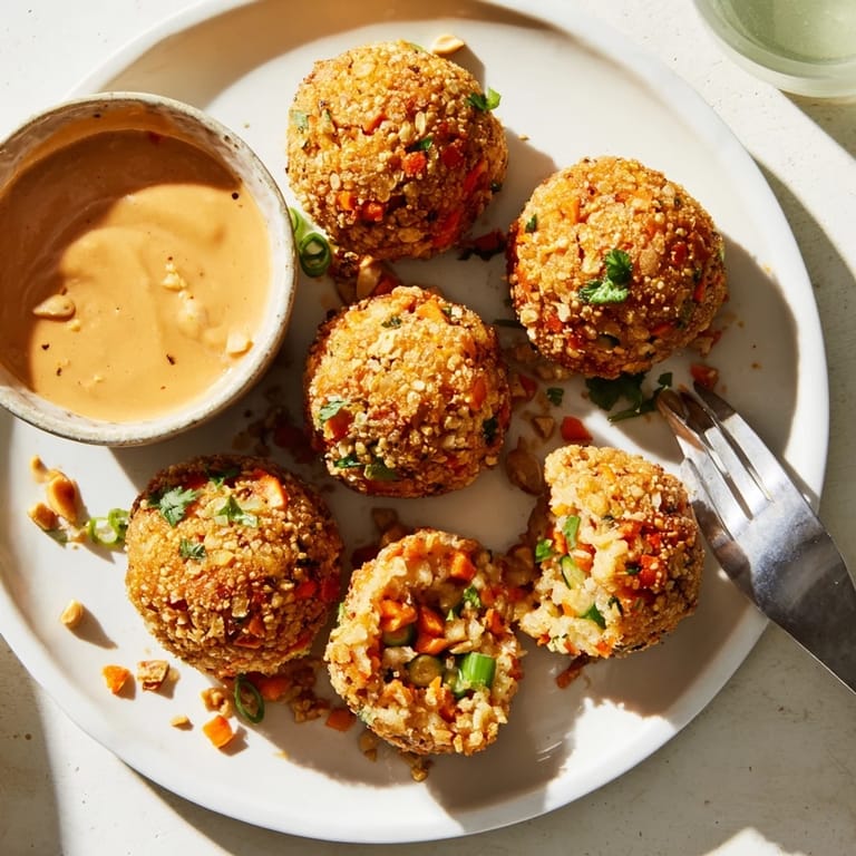I first made these rice balls for a casual family gathering and everyone loved picking them up and dipping into the fragrant peanut sauce. They bring both crunch and creaminess, making them an instant favorite whenever I serve them.
