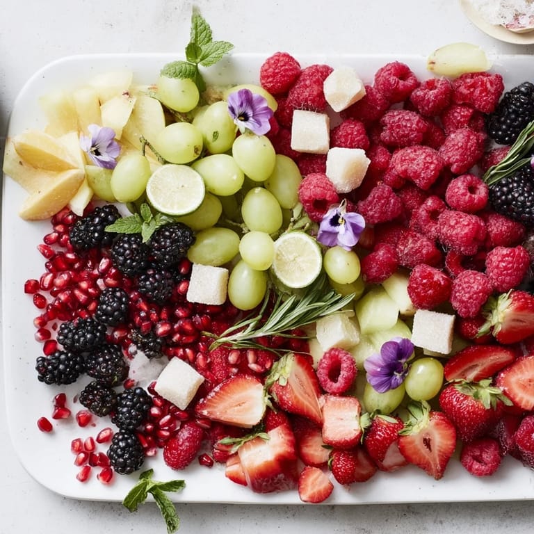 - Fresh Fruits: 1 cup fresh raspberries, 1 cup fresh blackberries, 1 cup fresh strawberries hulled and halved, 1 cup pomegranate arils, 2 lemons thinly sliced into rounds, 2 limes thinly sliced into rounds, 1 orange thinly sliced into half-moons, 1 cup seedless green grapes halved