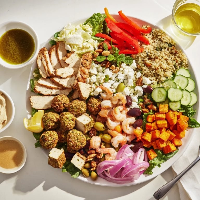 Assorted proteins such as grilled chicken, tofu, shrimp, and falafel suit different dietary needs. Prepare each separately and keep warm or room temperature for best flavor.