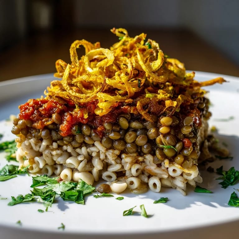 Save to Pinterest My first encounter with koshari happened on a crowded Cairo street corner at dusk, the smell of fried onions mixing with cumin and tomatoes so thick you could almost taste it before eating. A vendor assembled the dish with such casual precision—rice, lentils, pasta layered like edible architecture—that I knew immediately this wasn't just street food, it was strategy. Years later, standing in my own kitchen on a day when nothing felt quite right, I made it without thinking much, and suddenly the chaos sorted itself into something warm and deliberate. That's when koshari became my answer to needing comfort that actually fills you up.