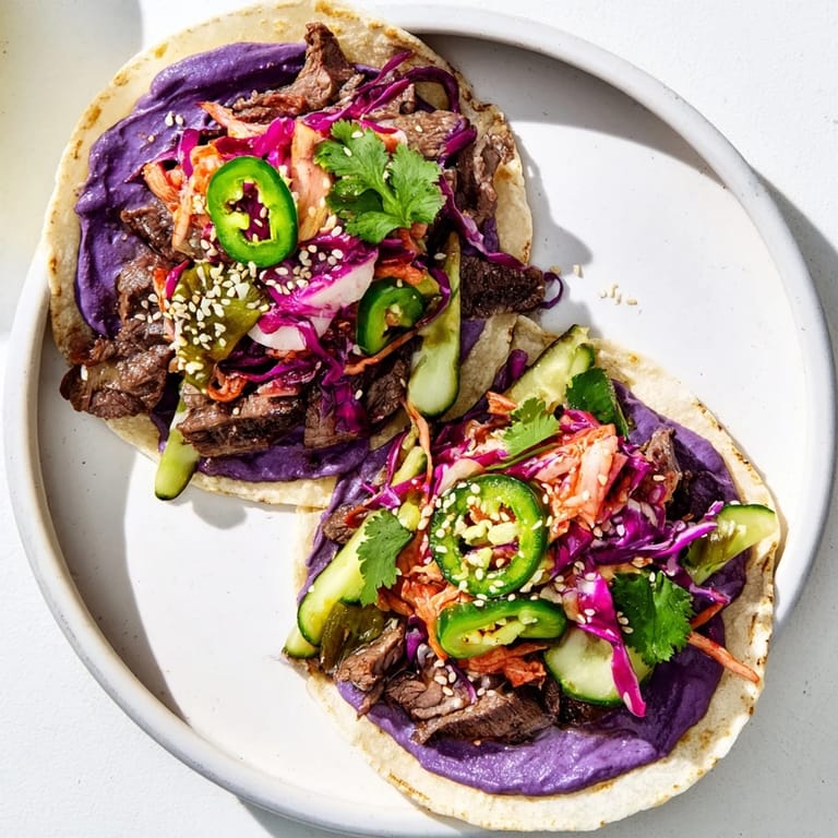 A vibrant flavor-packed recipe blending inspirations from street food around the world &mdash think Korean bulgogi tacos Filipino ube crema and zesty Mexican toppings. Perfect for a fun customizable meal!