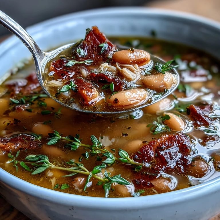 This hearty dish combines tender navy beans with savory smoked ham and aromatic fresh thyme, simmered slowly to develop deep, comforting flavors. Vegetables like carrots, celery, and onion add a natural sweetness and texture. The soup is gently seasoned with bay leaves and black pepper, creating a rustic, warming experience perfect for cooler days. Optional garnishes like fresh parsley and crusty bread round out the meal for a satisfying farmhouse-style finish.