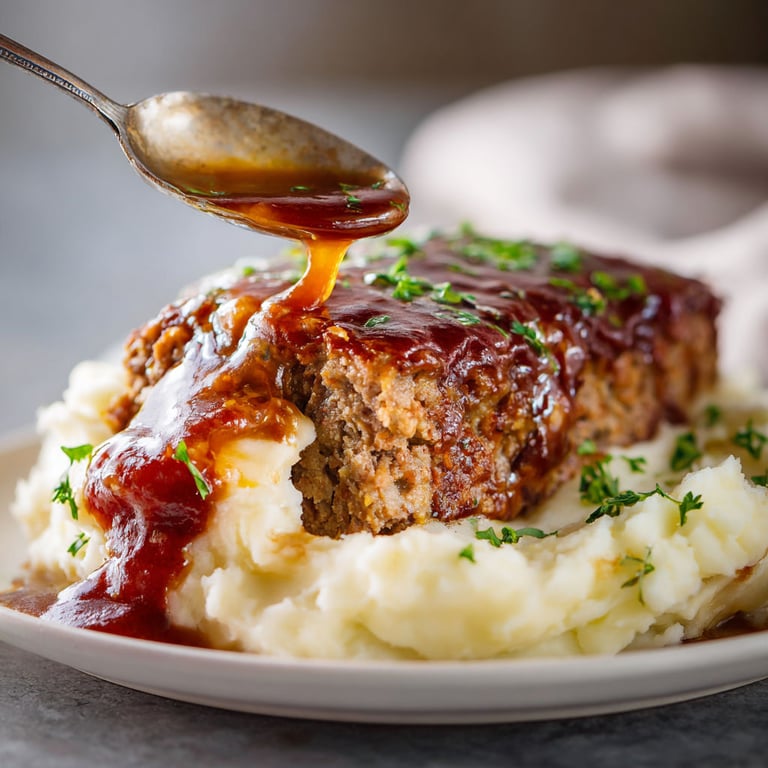 Tender meatloaf slices served alongside smooth, buttery mashed potatoes for a comforting meal.