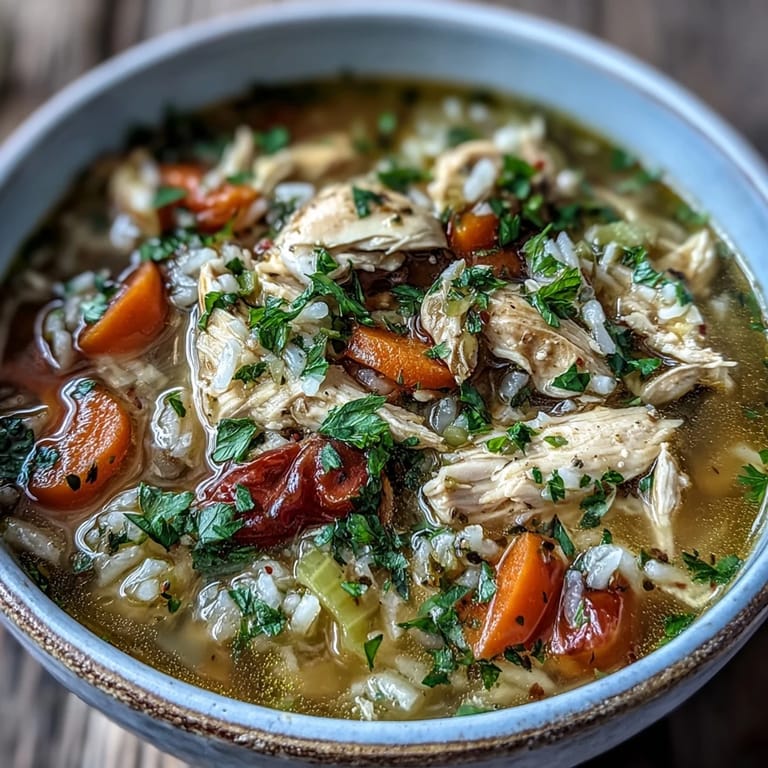 Save to Pinterest This hearty soup embodies the essence of comfort food while keeping things light and healthy. The combination of aromatic vegetables—onion, carrots, and celery—creates a flavorful base, while herbs like thyme and oregano add depth and warmth. The chicken becomes incredibly tender as it simmers in the broth, and the rice soaks up all those wonderful flavors. A final touch of fresh lemon juice and parsley brightens the entire dish, making each spoonful feel both comforting and refreshing.