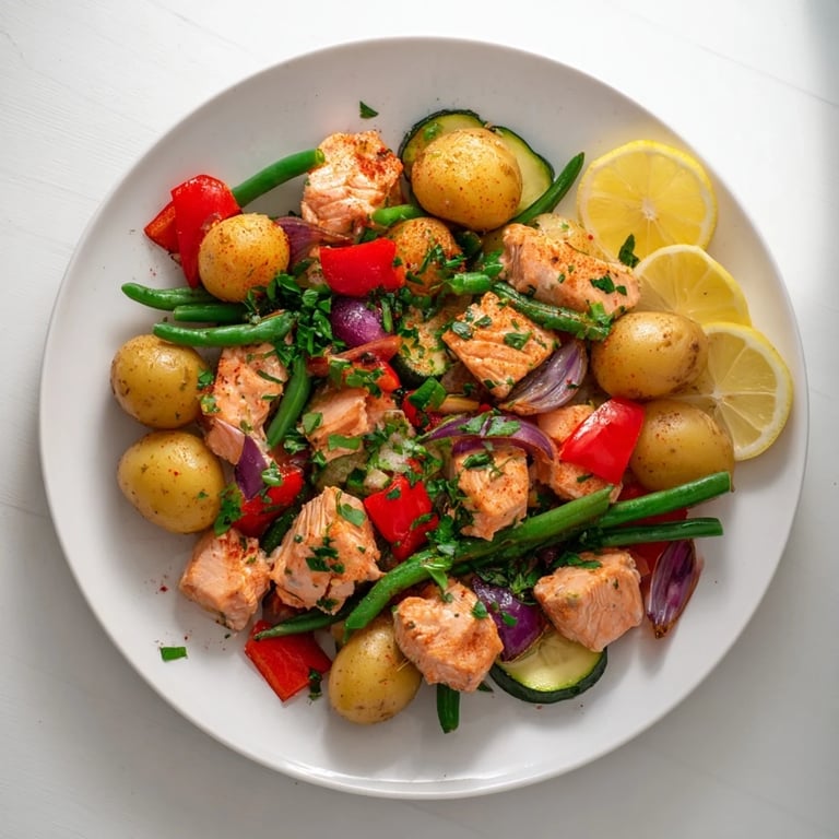 Save to Pinterest A flavorful one-pan meal featuring tender salmon pieces, golden potatoes, and vibrant vegetables, perfect for stretching a smaller portion of salmon into a satisfying, balanced dish.