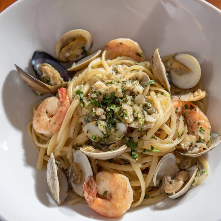 Linguine tossed with shrimp, clams, mussels in a fragrant white wine and garlic sauce, finished with lemon.