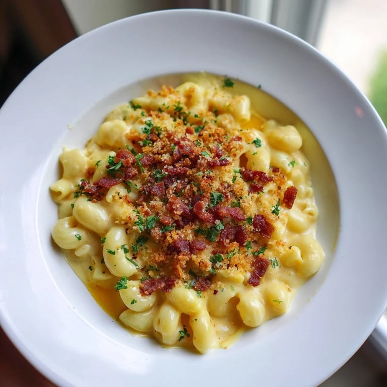 Save to Pinterest A comforting, creamy mac and cheese baked on a sheet pan for maximum crispy edges, topped with a savory bacon crumble for extra flavor and crunch.