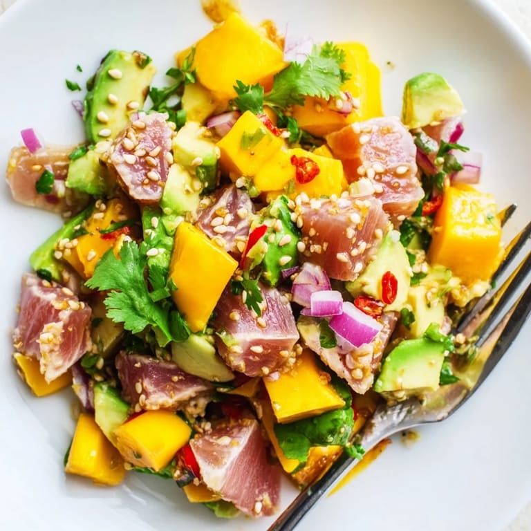 A vibrant, refreshing salad featuring tender tuna, sweet mango, creamy avocado, and a spicy kick—perfect for a light lunch or a summery appetizer.