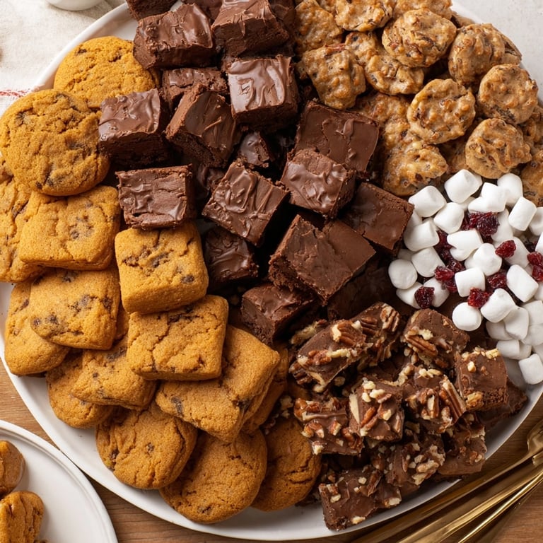 - Arrange the fudge squares, pumpkin cookies, and pecan shortbreads in sections on your platter. Tuck in small piles of mini marshmallows, dried cranberries, and chopped pecans as pops of color. Drizzle melted white chocolate over a few cookies or fudge pieces if you like for a final festive touch.