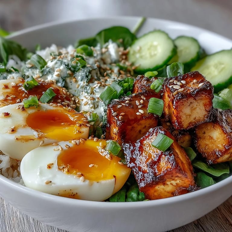 Save to Pinterest There's something about a perfectly jammy egg sitting atop warm rice that makes mornings feel intentional. I discovered this bowl during a phase when I was trying to eat better but refused to sacrifice flavor, and it clicked immediately—crispy tofu, that gloriously runny yolk, and a ginger scallion sauce that tastes like it took hours but genuinely doesn't. What started as a random Tuesday breakfast became my go-to when I wanted something that felt fancy without the fuss.