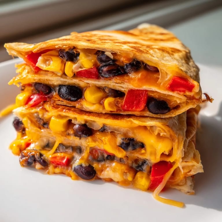 This dish features baked tortilla wraps layered with a seasoned mix of black beans, corn, bell pepper, and onions. Combining shredded cheddar and Monterey Jack cheeses adds melty, creamy texture. The wraps are folded into triangles and baked until golden and crisp, delivering a satisfying meal with customizable toppings like salsa, sour cream, and avocado. Ideal for a quick, wholesome option with Tex-Mex flavors.